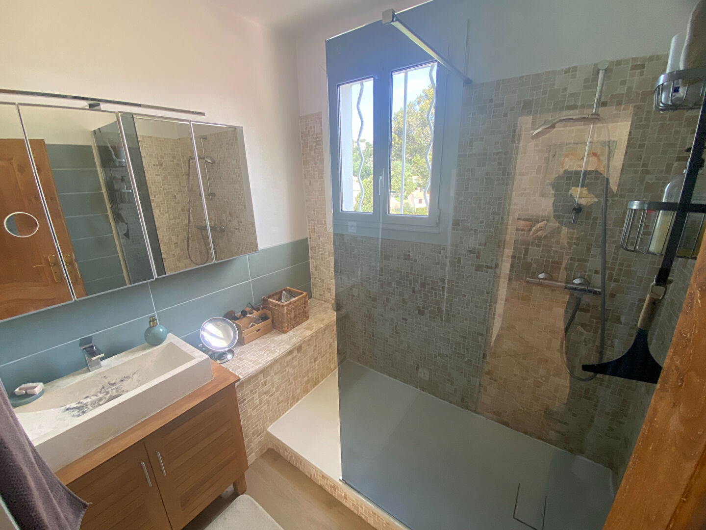 A l’étage : une belle pièce de vie lumineuse de 50 m² avec cuisine américaine, une chambre, une salle d’eau avec douche à l’italienne, un wc individuel.